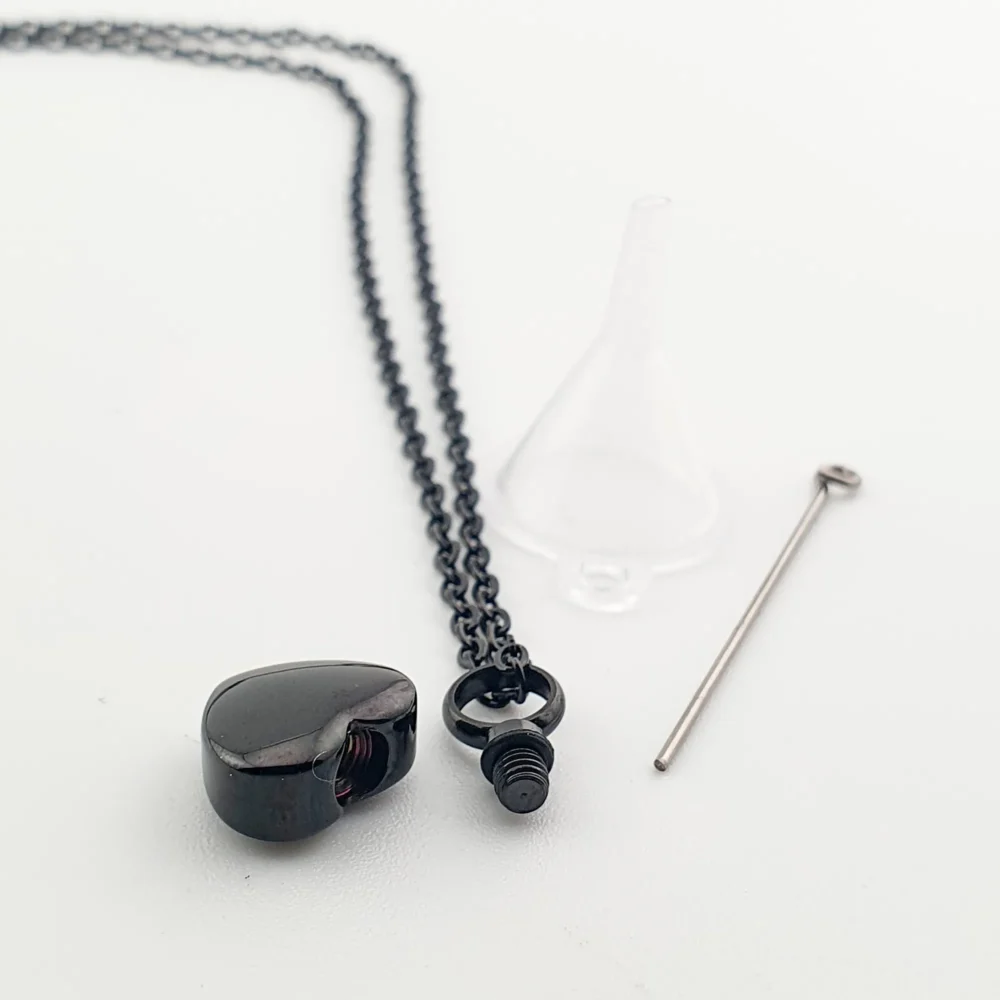 Aan de zijkant van de hanger zit een discrete schroefsluiting die toegang geeft tot het binnengedeelte. Het sieraad wordt geleverd met een trechter en stang, waardoor het vullen van de hanger zowel eenvoudig als respectvol kan worden gedaan.