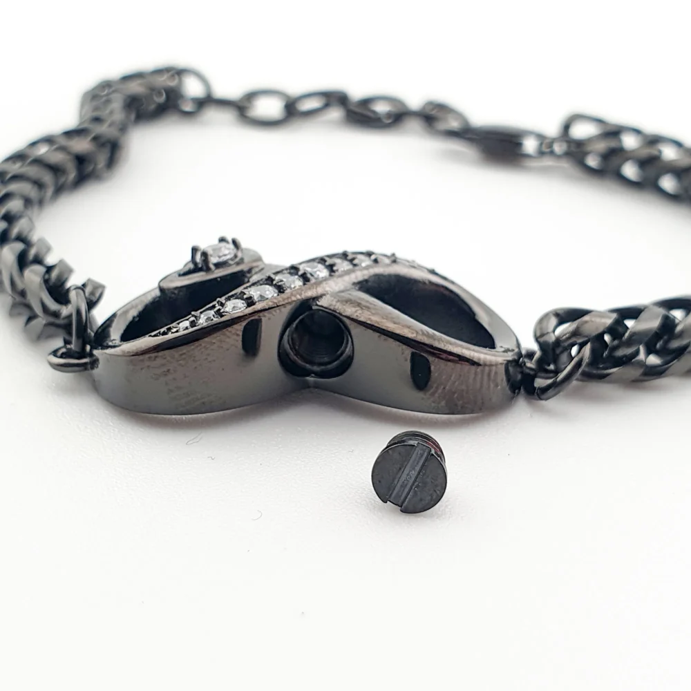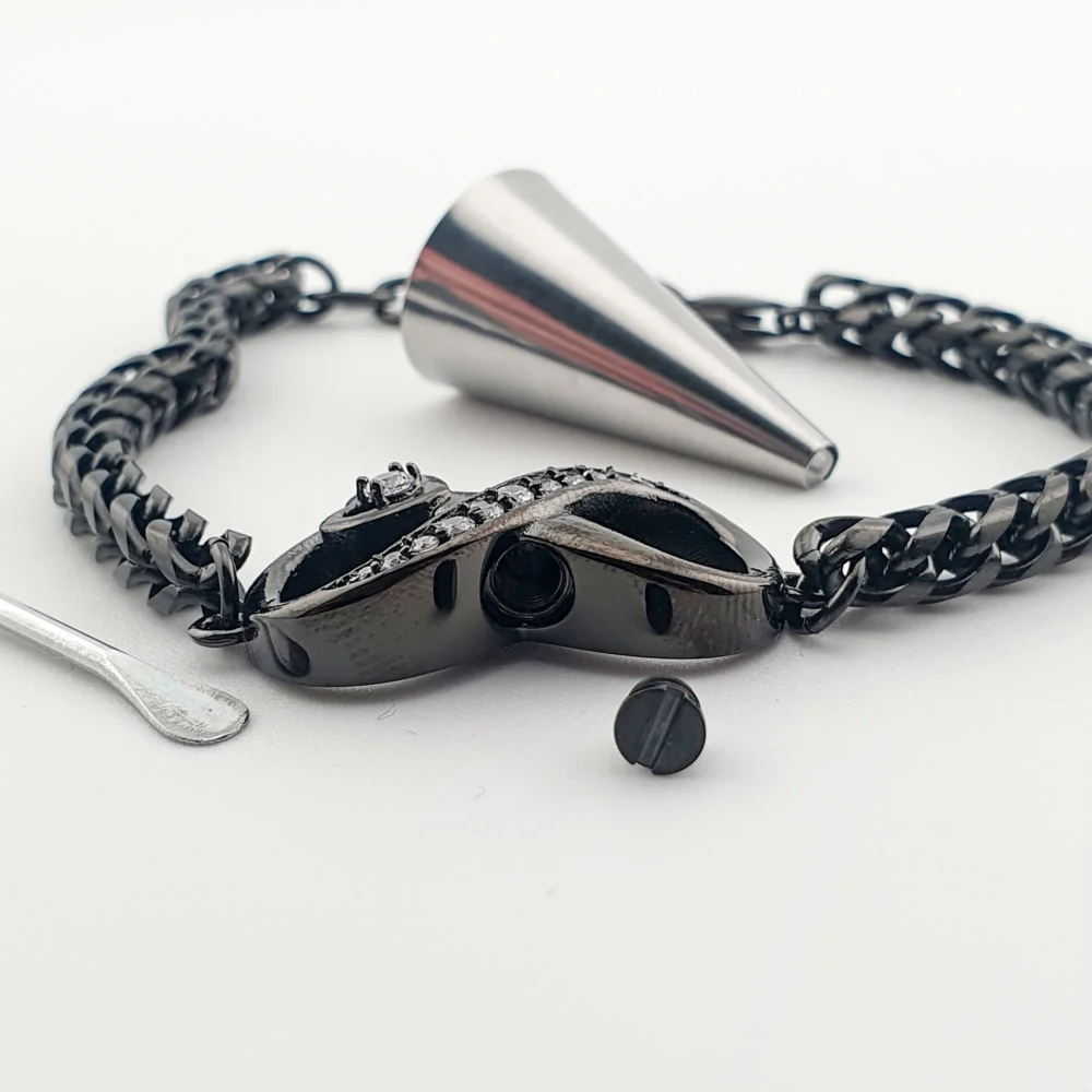 De armband beschikt over een duurzame schakelketting die zowel elegant als comfortabel is om te dragen. De hanger heeft een schroefdop, waardoor de as veilig wordt bewaard. Deze zilveren armband biedt een perfecte balans tussen stijl en emotionele waarde, waardoor je dierbare herinneringen altijd bij je zijn. Voor degenen die de voorkeur geven aan een donkere afwerking, is deze armband ook beschikbaar in een zwarte variant.