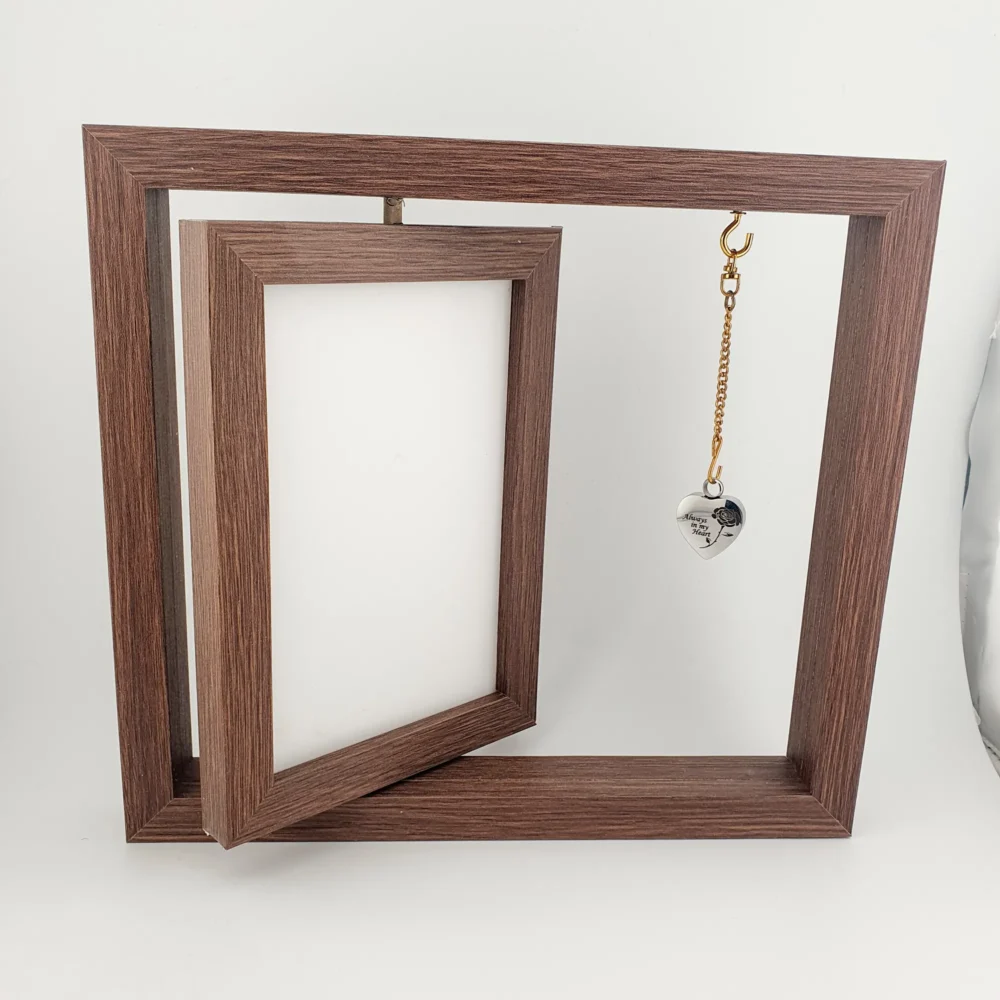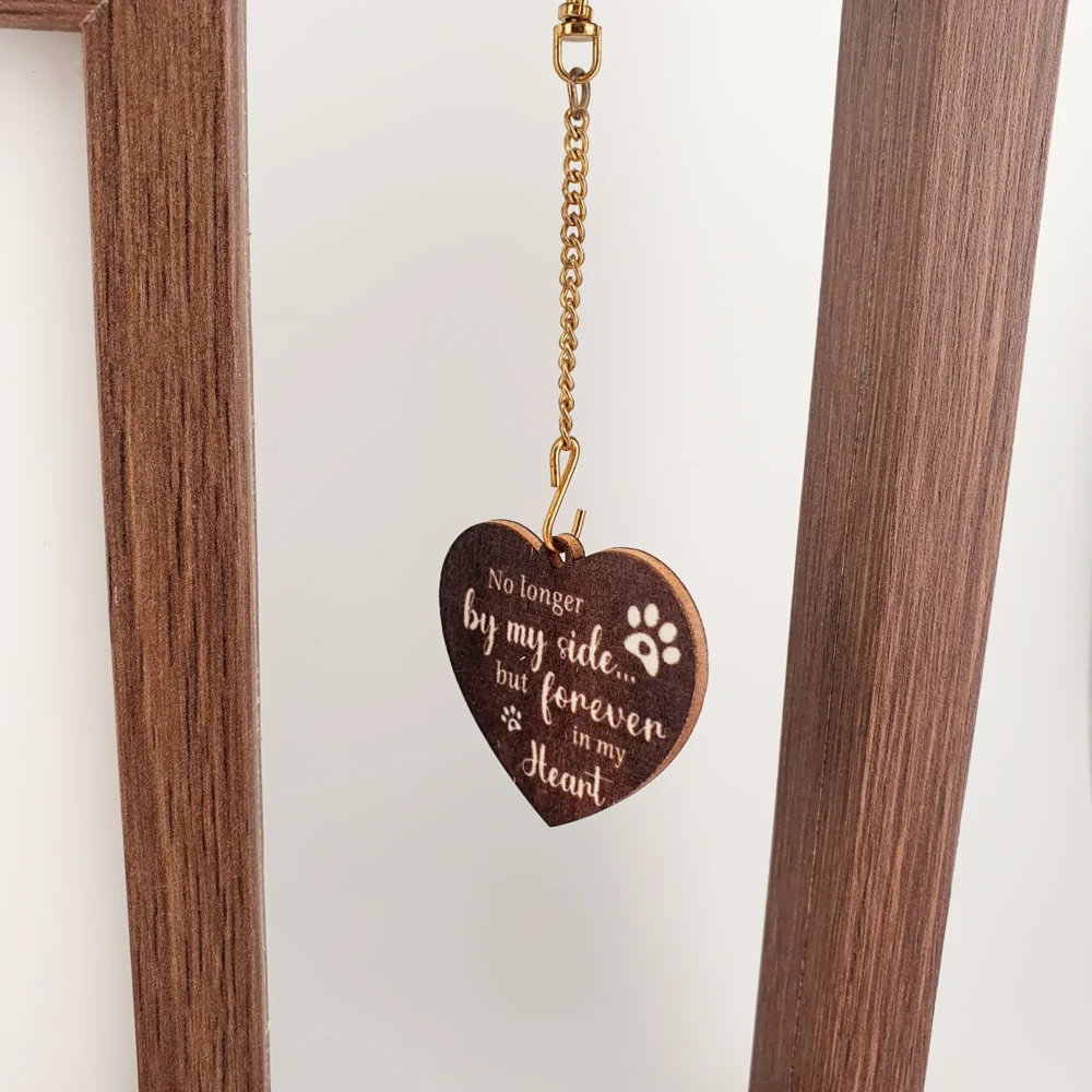 Bewaar de herinnering aan je geliefde huisdier of dierbare op een liefdevolle manier met deze stijlvolle herinneringsfotolijst. De lijst is gemaakt van houtlook materiaal en heeft een uniek open ontwerp met een hanger in de vorm van een hartje aan een goudkleurige ketting. Op het hartje staat de tekst: