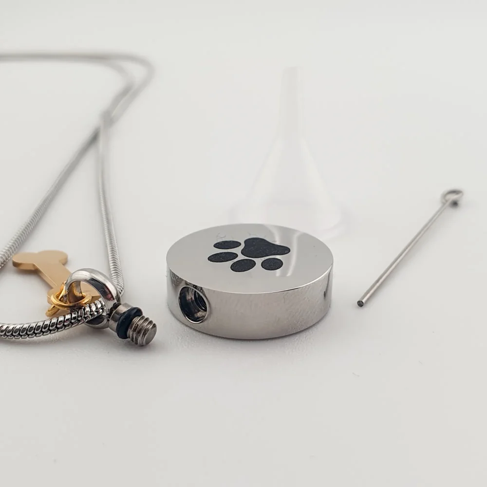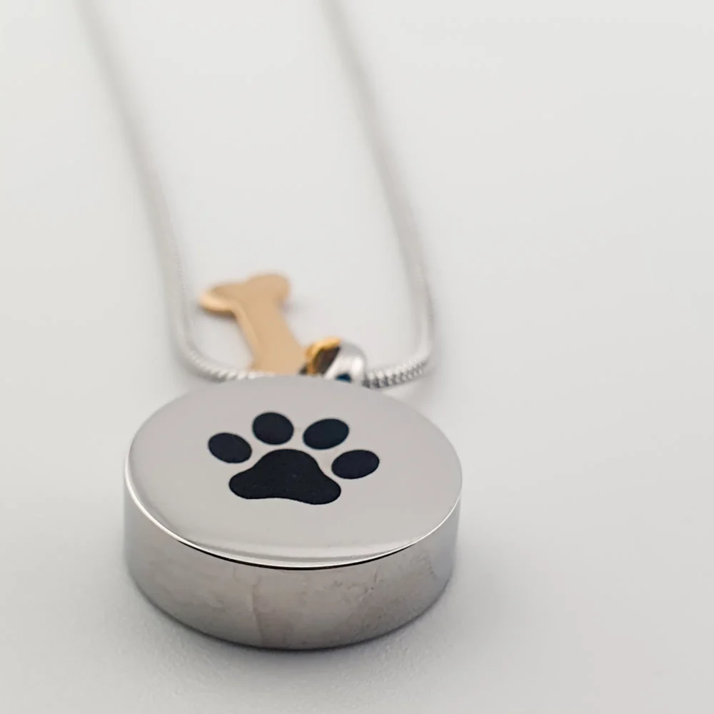 Deze hanger bevat een klein compartiment aan de binnenzijde, speciaal ontworpen om een symbolische hoeveelheid as of een ander klein aandenken veilig te bewaren. Perfect voor wie zijn trouwe vriend altijd bij zich wil dragen.
