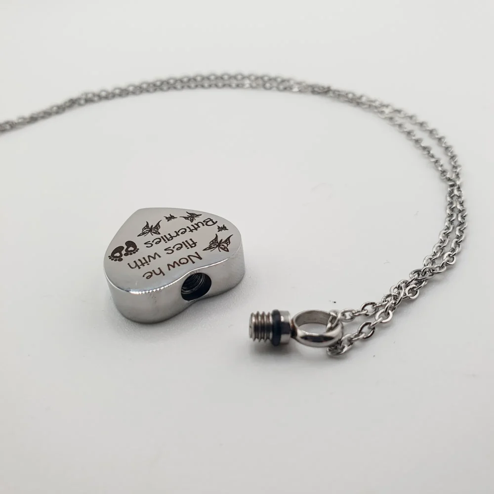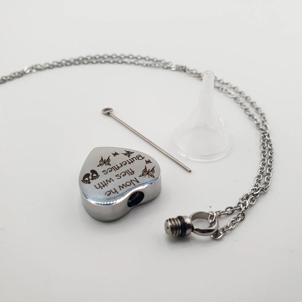 Deze hartvormige hanger is subtiel gegraveerd met de tekst “Now he flies with Butterflies,” waarbij de delicate vlinders en voetafdrukken een extra tedere touch toevoegen. Dit maakt het een perfect herinneringssieraad.